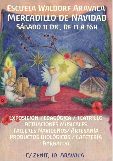 - El sábado 11 de diciembre, la escuela Waldorf de Aravaca tenía previsto convocar su mercadillo navideño, destinado a recaudar fondos para las becas de los niños. Pero esta mañana nos han comunicado la necesidad de posponer el evento por algunos casos detectados de covid. En cuanto nos den una nueva fecha la publicaremos sin falta.