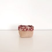 Yute natural y tela de estrellas sobre fondo granate 70 % algodón y 30 % acrílico. Si te gusta más la cestita en color crudo en lugar del yute, no dudes en escribirnos, la confeccionaremos encantados para ti.