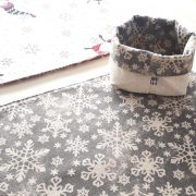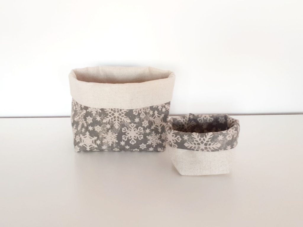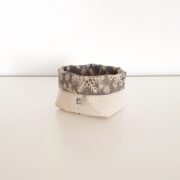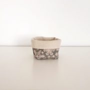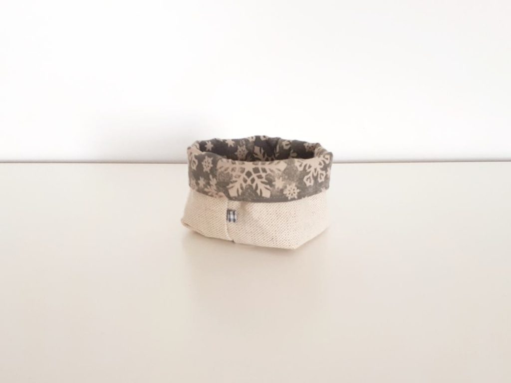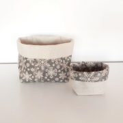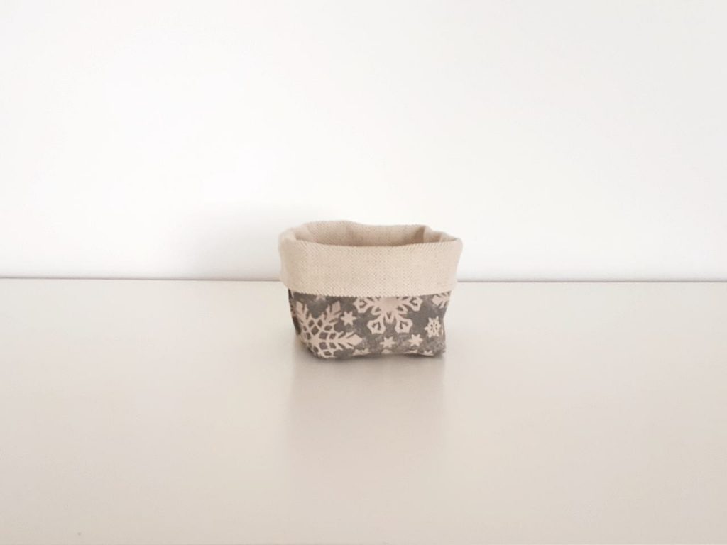 Cesta pequeña de tela gris con estrellas y tela color crudo. Otra idea de presentación en la mesa con estas cestas pequeñas de tela, ideales para picos de pan o similar que acompañarán cualquier aperitivo.