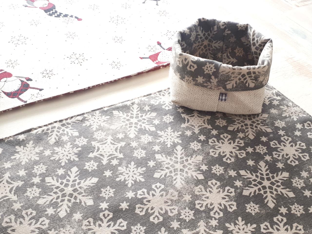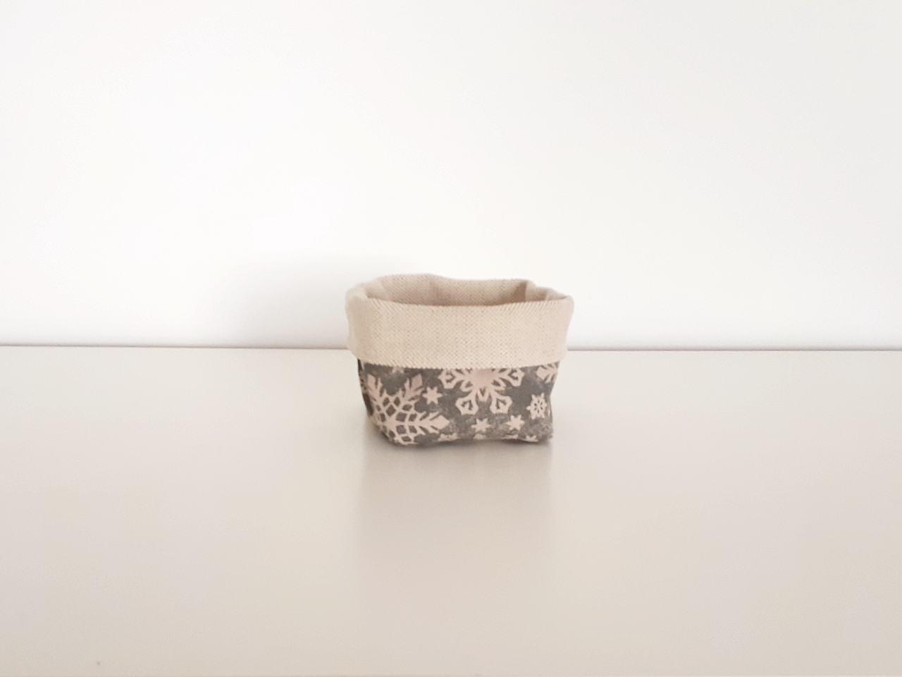 Cesta pequeña de tela gris con estrellas y tela color crudo. Otra idea de presentación en la mesa con estas cestas pequeñas de tela, ideales para picos de pan o similar que acompañarán cualquier aperitivo.