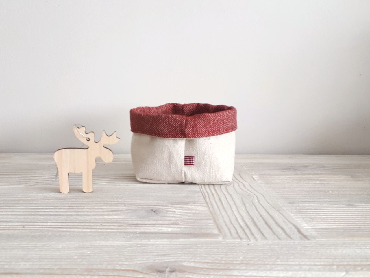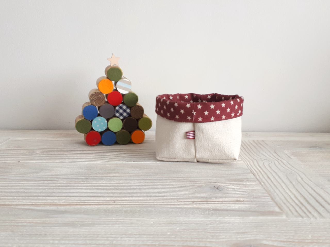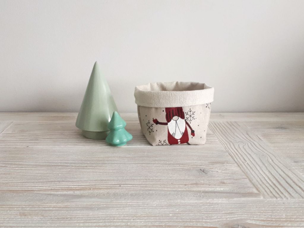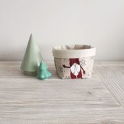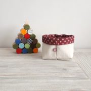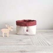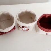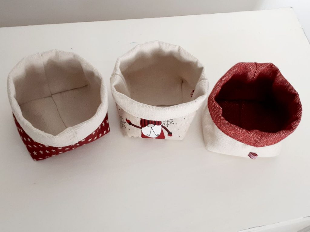 Las tres cestas están confeccionadas, por un lado, en tela color crudo 100 % algodón. Por el otro lado, en el caso de la tela de gnomos y de la tela burdeos, 50% acrílico y 50 % algodón. La tela de estrellitas 70% algodón y 30 % acrílico.
