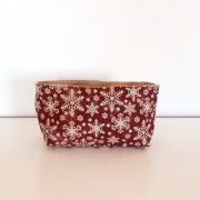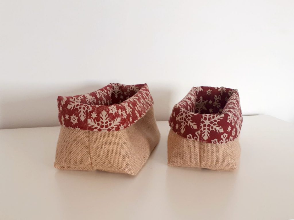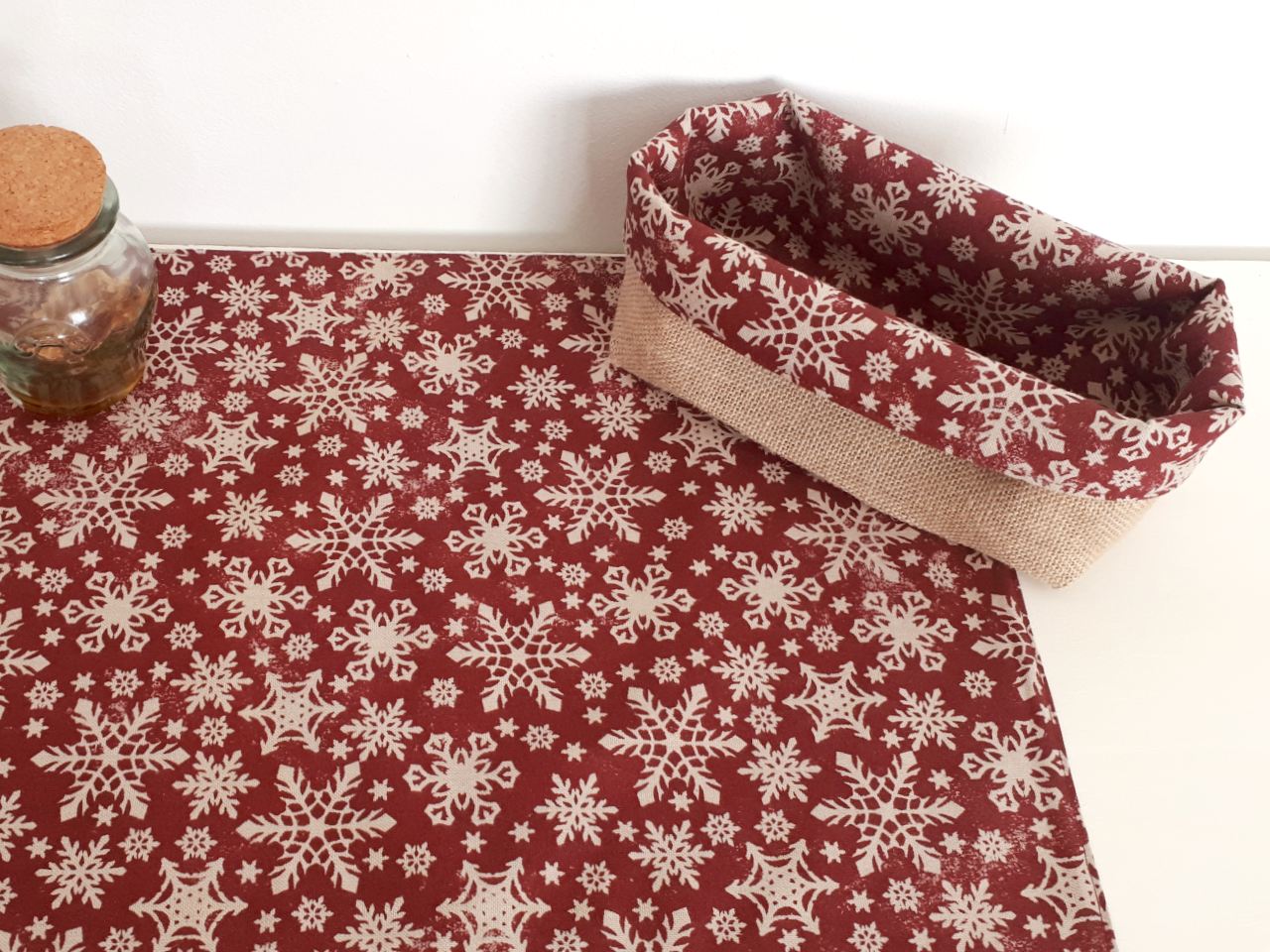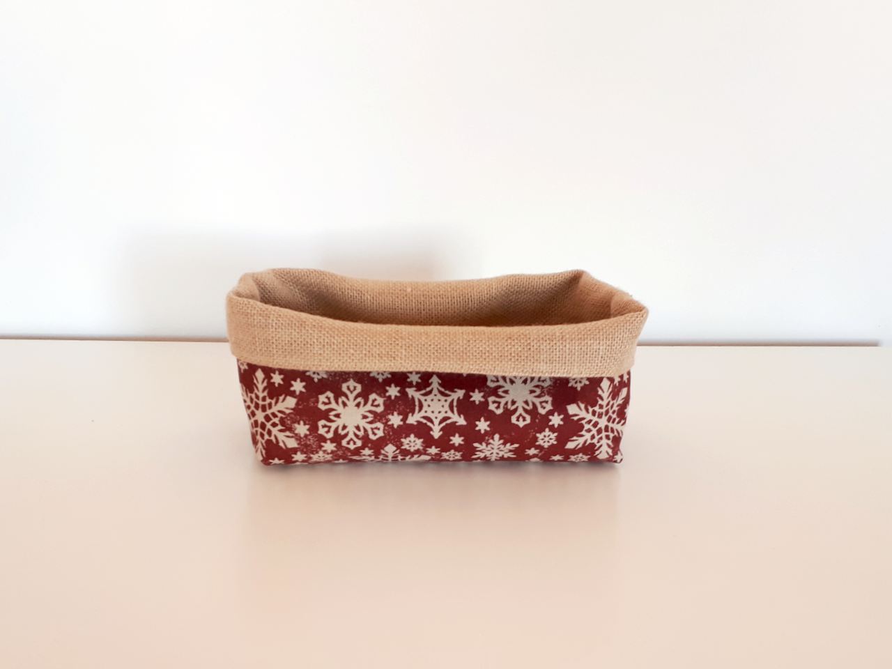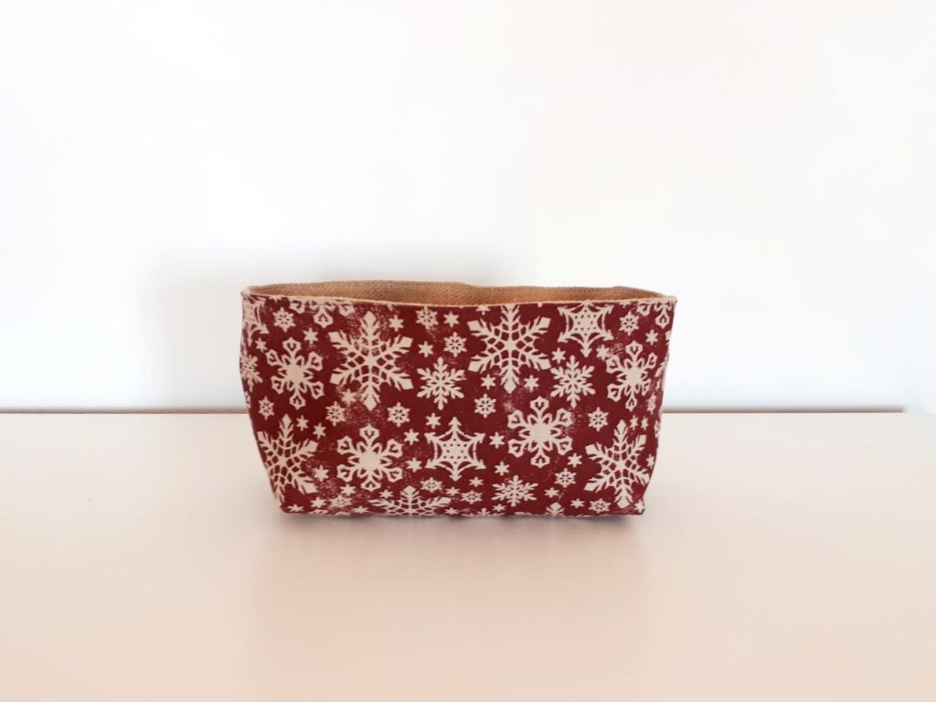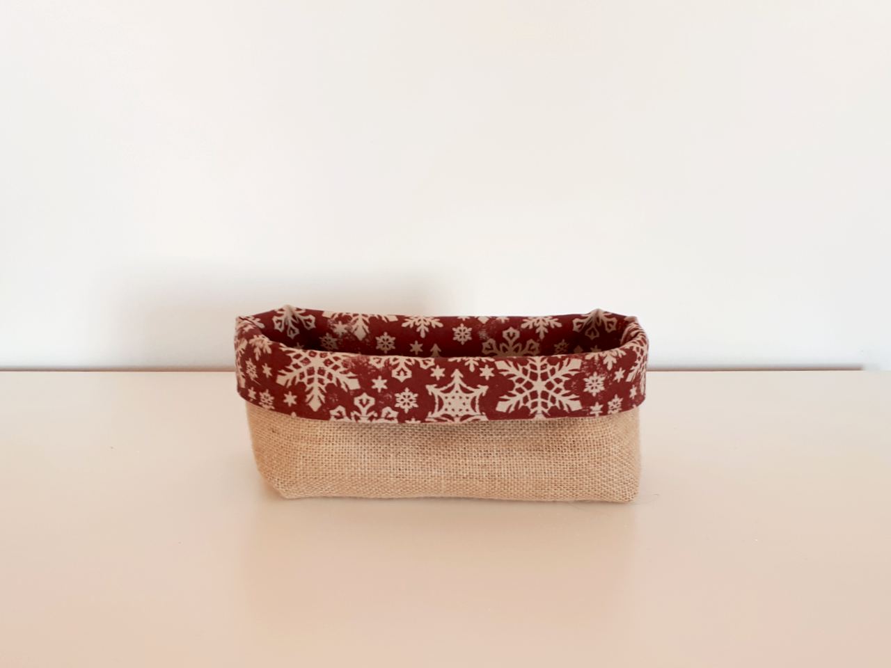 Composición de la tela de estrellas sobre fondo granate: 70 % algodón y 30 % acrílico. La otra tela es yute natural.